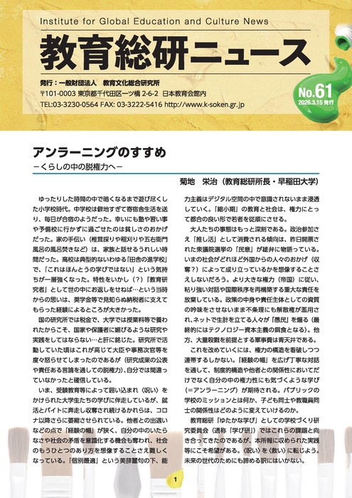 一般財団法人 教育文化総合研究所(教育総研)は、日本国憲法及び子どもの権利条約に基づく教育の確立と文化の創造に寄与するため、2016年に設立されました。教育総研は、1991年に発足した前身の国民教育文化総合研究所に引き続き、各界からの研究協力者と共に、教育・文化のあり方について幅広い研究を積み重ね、同時に学校現場の課題を意識しながら、今日的視点にたった政策提言を行っています。
